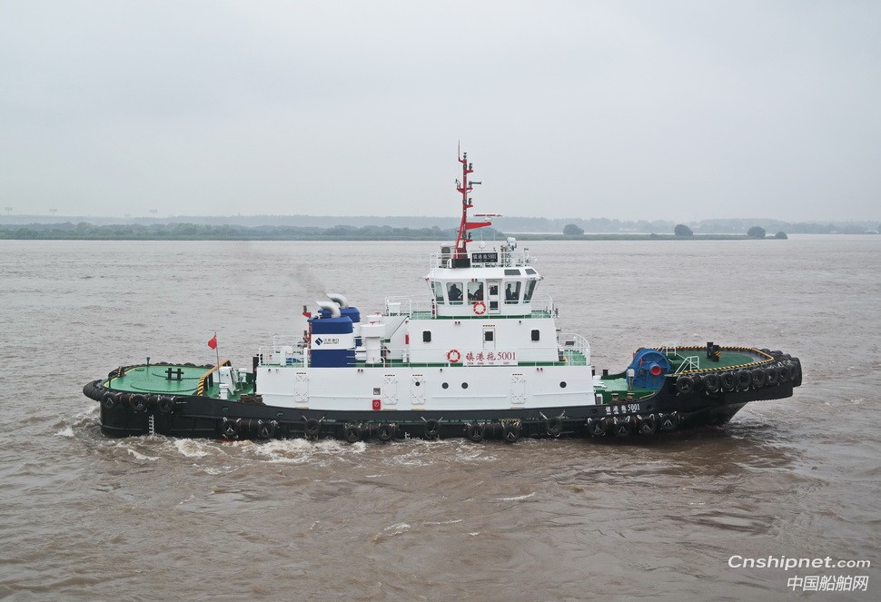 2020年7月15日,由江苏省镇江船厂(集团)有限公司为镇江港务集团有限公司设计建造的功率2×1840 kW全回转港作拖船——“镇港拖5001”完工交付,顺利启航。该船是目前我国长江内河港口功率最大的全回转拖船。