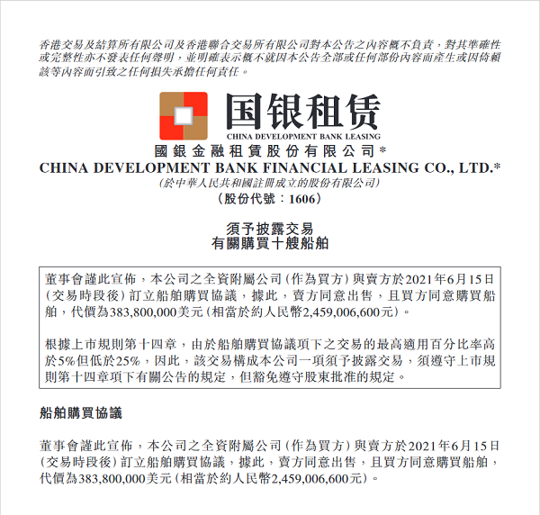 6月15日,国银金融租赁股份有限公司发布公告称,该公司全资附属公司国银租赁(国际)有限公司与江苏新时代造船有限公司签订了10艘5万吨级MR型油化船购买协议,总价值为3.838亿美元(约合约人民币24.59亿元)。