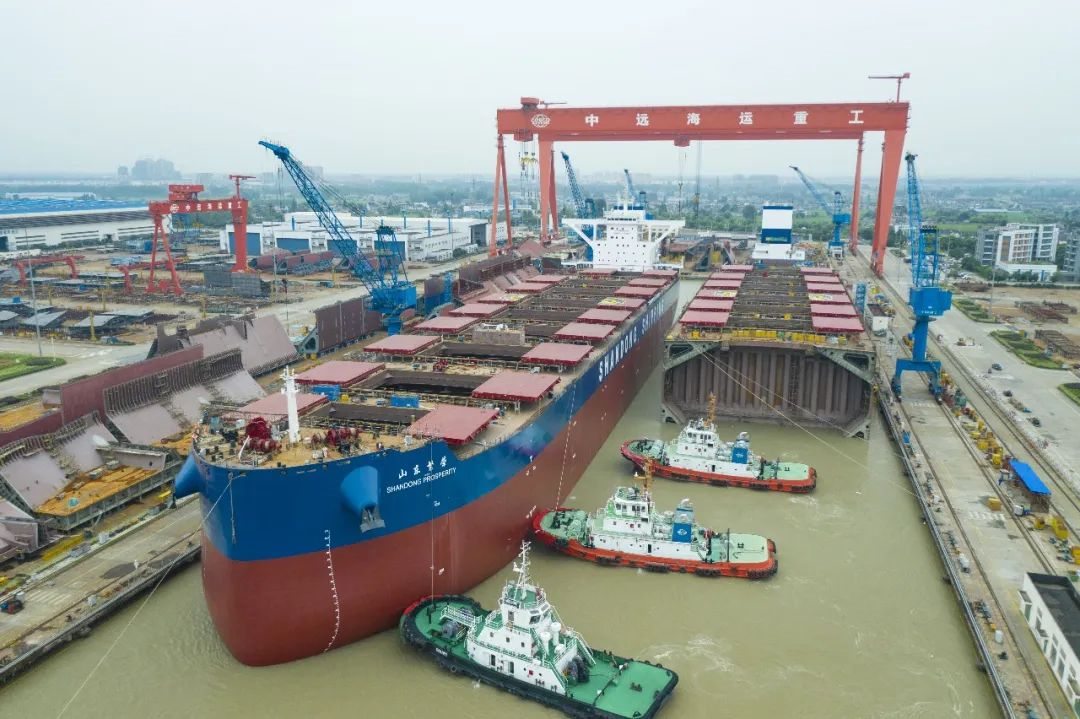 7月16日,扬州中远海运重工为国银租赁建造的21万载重吨散货船首制船在2#坞按照计划节点顺利下水。