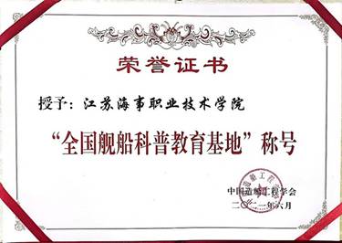 2021年中国造船工程学会启动全国舰船科普教育基地遴选工作,由江苏省造船工程学会推荐、江苏海事职业技术学院组织申报的”舰船科普教育“项目,经中国造船工程学会组织评审, 被批准授予“全国舰船科普教育基地“称号。
