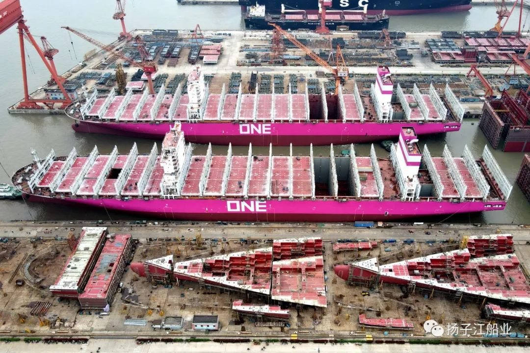 3月22日,扬子鑫福两艘11800TEU集装箱船同时顺利出坞。