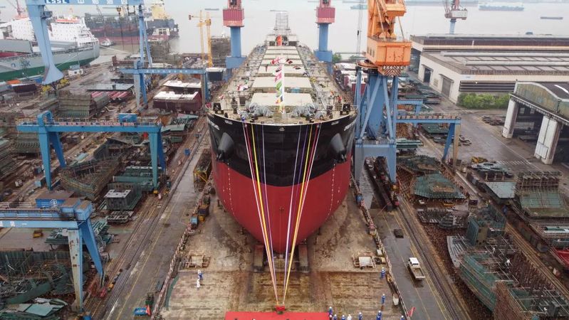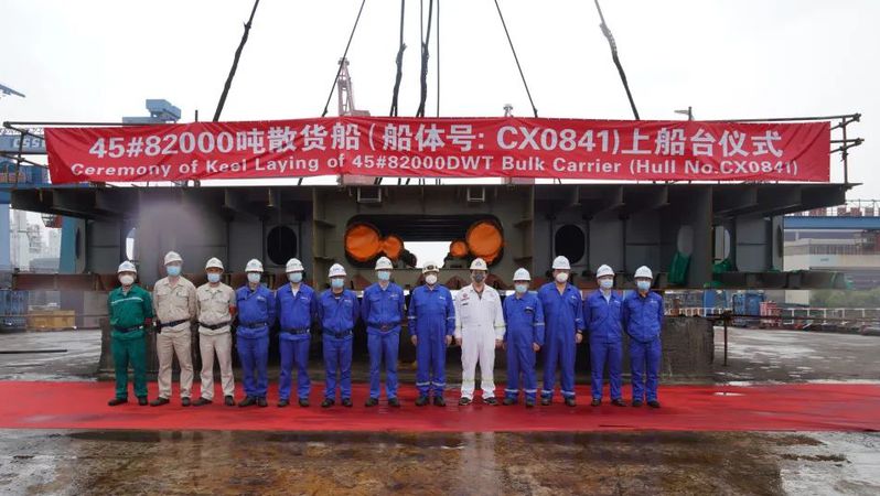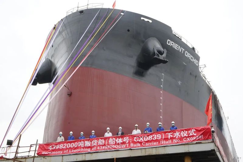 2022年4月23日是中国人民海军成立73周年的喜庆日子,当天上午9:08,在公司上下各部门共同努力和船东船检大力支持下,中国船舶集团旗下中船澄西船舶修造有限公司主建船型新82000吨系列船的首制船43号82000吨散货船提前胜利下水,船台周期50天。