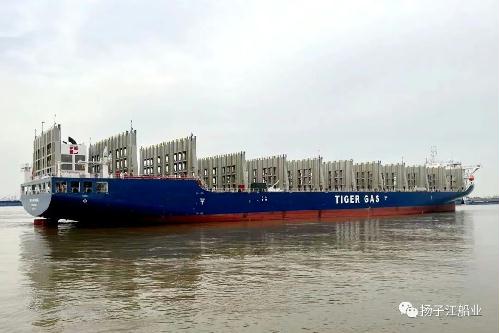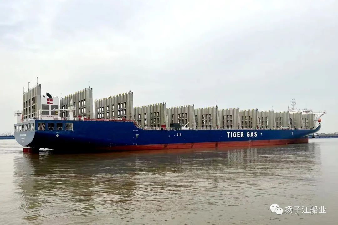 5月15日,扬子江船业集团与老虎燃气联合研发由新扬子造船建造的第三艘700箱级罐箱甲板船“TIGER LIANYUNGANG”轮从码头出发开启首航。