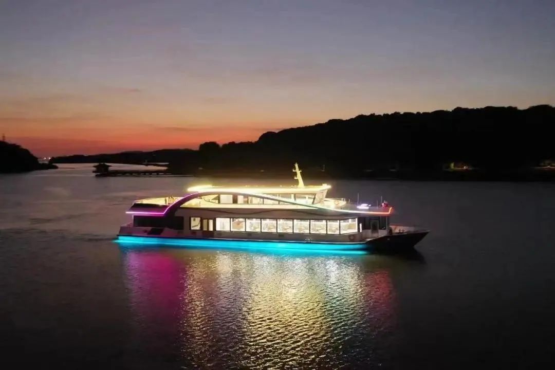 “太湖明珠壹号”最大船长40m,型宽9m,型深2m,搭载赛思亿基于直流组网技术的新能源混合动力系统,系统配置2台160kW的发电机组,2套245kWh锂电池组,驱动2台90kW的主推电机,关键变频电控设备采用赛思亿自主知识产权产品。赛思亿新能源混合动力系统具备纯电池动力、柴电动力和混合动力三种推进模式,并且推进模式可根据船舶不同航行需求灵活选择。值得一提的是,在纯电池动力模式下全船噪音低于56分贝,可以充分满足游客观光游览需求。