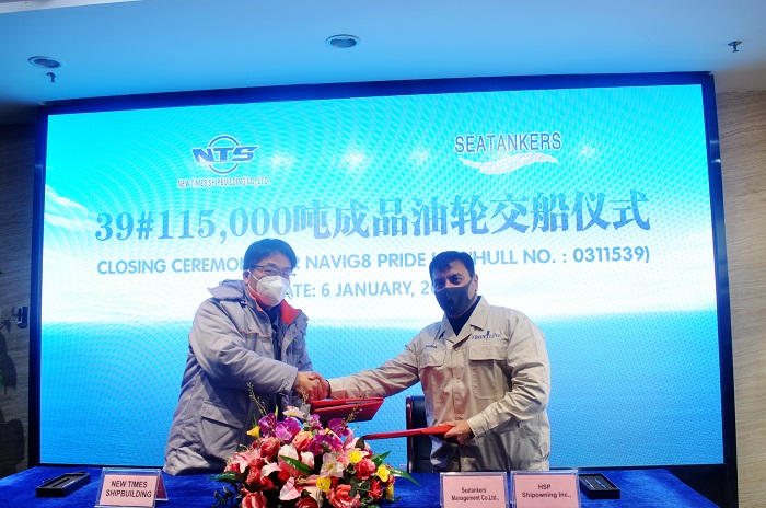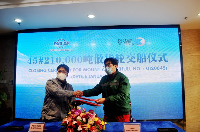 1月6日,新时代造船公司总经理刘海金、常务副总经理张玉永、副总经理袁衡等领导分别出席了45#210000吨双燃料动力散货船、39#115000吨油船的签字交付仪式,见证船舶交付过程。