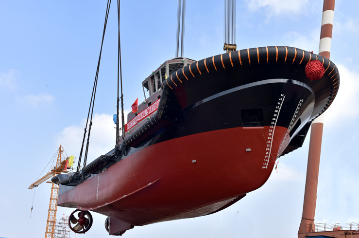 2023年4月7日,由江苏省镇江船厂(集团)有限公司为宁波油港轮驳有限公司设计建造的3680kW混合动力全回转拖船——“甬港拖80”顺利接水。