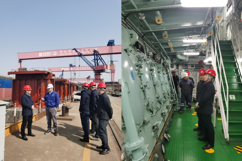 温华兵一行参观了船坞、码头、船台等作业一线,并登上了全球首制支线甲醇双燃料集装箱船实地考察。公司负责人详细介绍了船厂订单、生产等情况,以及新型船舶制造工艺等。调研座谈会上,徐斌代表公司对温华兵一行表示了热烈欢迎,他介绍了公司的发展历程和近几年建设发展所取得的成绩,重点介绍了公司在散货船、新型双燃料船设计建造方面的特色和成绩,对公司与学校将来的合作充满期待。