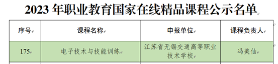 近日,教育部公示了2023年职业教育国家在线精品课程认定结果,江苏省无锡交校冯美仙老师主持的《电子技术与技能训练》课程成功入选并上线国家职业教育智慧教育平台,实现我校国家在线精品课程零的突破。