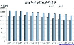 2016年,全国造船完工量为3532万载重吨,同比下降15.6%;承接新船订单量为2107万载重吨,同比下降32.6%;截至2016年12月底,手持船舶订单量为9961万载重吨,同比下降19%。出口船舶在全国造船完工量、新接订单量、手持订单量中所占比重分别为94.7%、77.2%、92.6%。