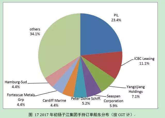 从船东角度来看,与三大国有造船集团具有很大的不同,在扬子江船业集团手持订单的船东中,两大航运央企难觅踪影,船东类型更为国际化。新加坡太平船务为第一大船东,订单量共计61万CGT,占比为23%;其次为工银租赁,手持订单量为29万CGT,占比为11%;值得一提的是,其本身的航运和租赁公司在自己集团内下单19万CGT,占比为7%;加拿大的塞斯班的手持订单量为16万CGT,占比为6%。2017年初扬子江集团手持订单中船东总数为26家,前五家航运企业占扬子江集团手持订单量的52.6%,前十名有来自中国、新加坡、加拿大、希腊、澳大利亚、德国、孟加拉等许多国家和地区的船东,扬子江集团拥有着遍布全球的业务合作伙伴,其国际化程度最高。(来源:谭船说市)