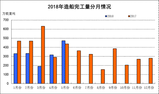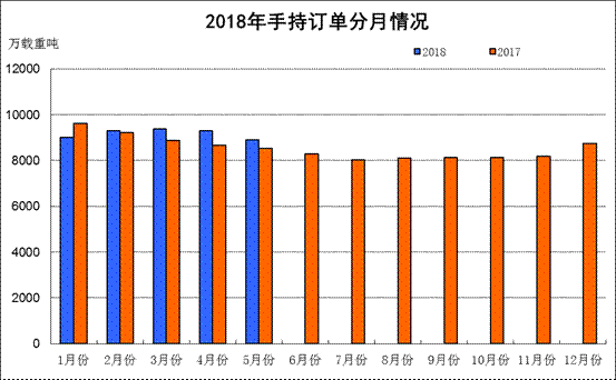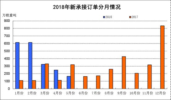 2018年1~5月份,我国新接船舶订单量和手持订单量继续增长,造船完工量降幅收窄,重点监测企业工业总产值等主要经济指标同比下降。