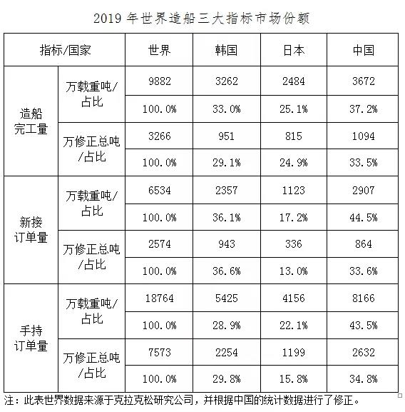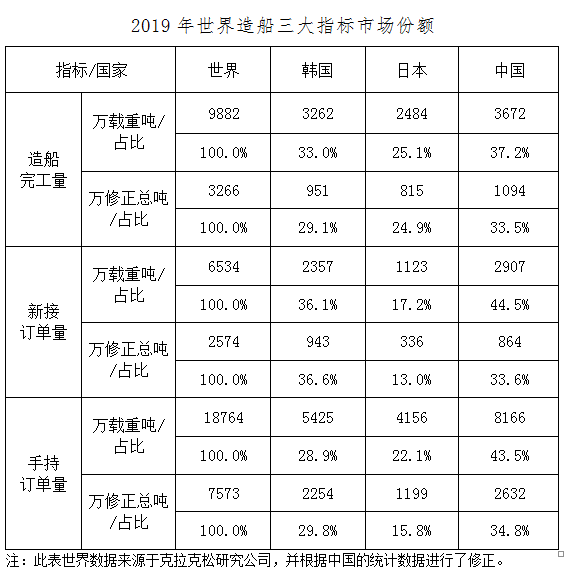 2019年,我国造船三大指标以载重吨计国际市场份额继续保持世界领先,造船完工量、新接订单量、手持订单量分别占世界市场份额的37.2%、44.5%和43.5%。我国分别有4家、6家和4家企业进入世界造船完工量、新接订单量和手持订单量前10强。