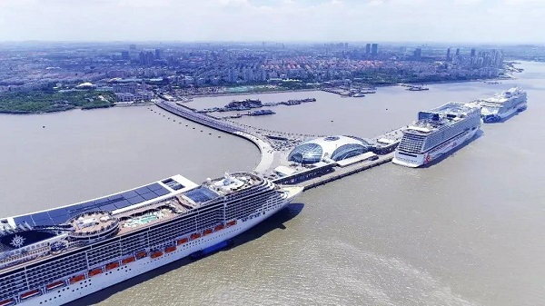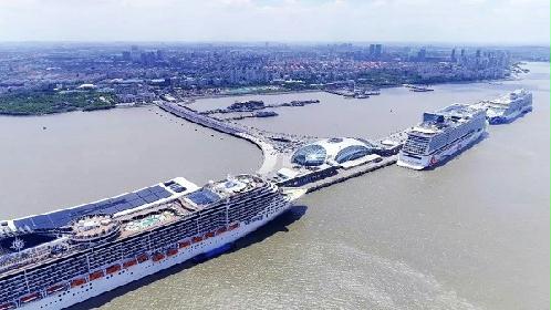 2018年7月13日,吴淞口国际邮轮港迎来“盛世公主”号、“诺唯真喜悦”号、“地中海辉煌”号三艘大型邮轮同时靠泊/来源:澎湃新闻