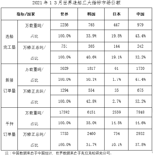 1~3月,我国造船完工量、新接订单量、手持订单量分别占世界市场份额的43.4%、47.4%和44.6%。(中国船舶工业行业协会)