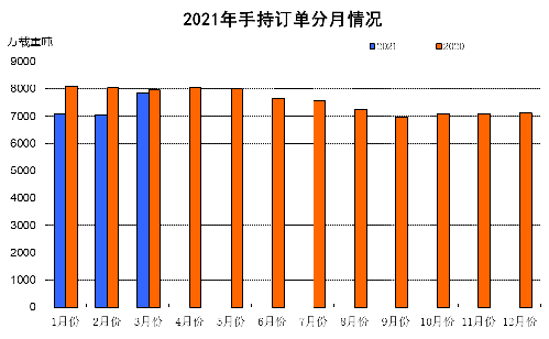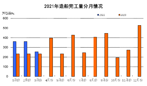 1~3月份,全国造船完工979万载重吨,同比增长39.8%。承接新船订单1720万载重吨,同比增长251.7%。3月底,手持船舶订单7848万载重吨,同比下降1.4%,比2020年底增长10.4%。