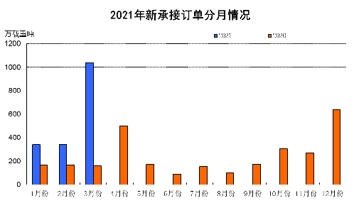 2021年1~3月份,世界经济逐步走出低谷,集装箱船运输市场率先回升,全球新船订单出现补偿性反弹。我国造船企业完工量和新承接订单量同比大幅增长,手持订单量与上年同期基本持平,但受原材料价格过快上涨的影响,重点监测企业生产经营仍面临较大挑战。