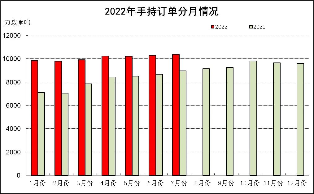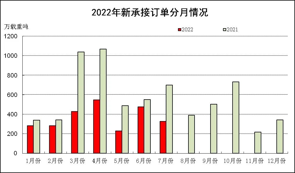 1~7月,50家重点监测造船企业造船完工1995万载重吨,同比下降15.5%。承接新船订单2412万载重吨,同比下降45.0%。7月底,手持船舶订单10041万载重吨,同比增长14.3%。