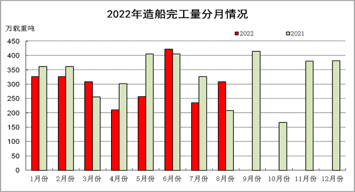 1~8月,50家重点监测的造船企业完工出口船2071万载重吨,同比下降15.9%;承接出口船订单2494万载重吨,同比下降42.9%;8月末手持出口船订单9001万载重吨,同比增长12.2%。出口船舶分别占重点造船企业完工量、新接订单量、手持订单量的90.4%、94.8%和91.1%。