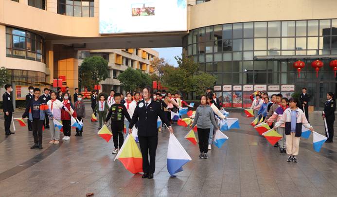 校园小广场上,旗语社的志愿者进行旗语展示,并教授小学生旗语的内涵,营造知航海、爱航海的良好氛围。