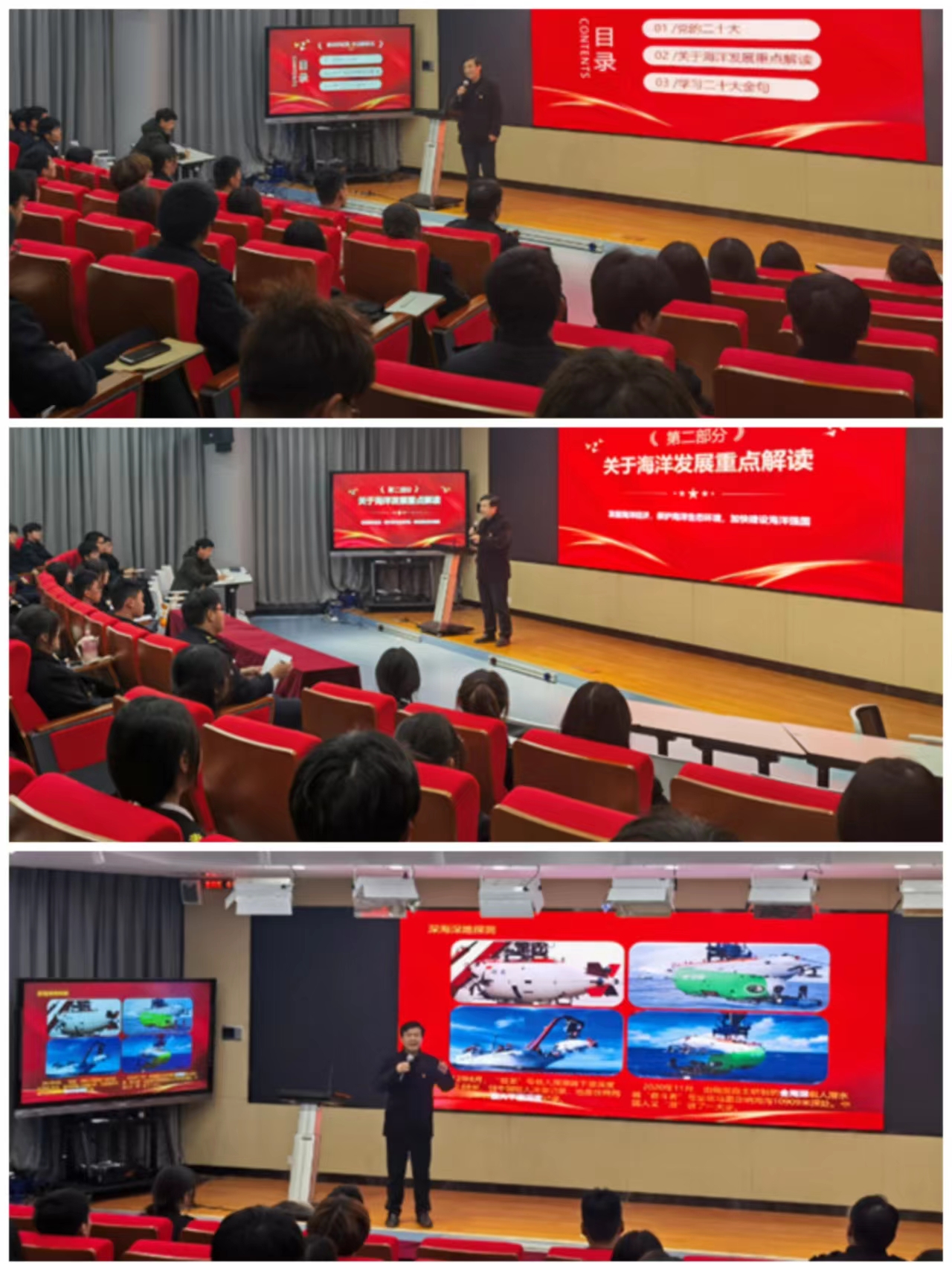 辅导报告向同学们传达了习近平总书记在中国共产党第二十次全国代表大会报告的基本精神,对报告中有关我国海洋事业的发展进行了重点解读。