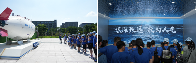 开营式包含了潜水器广场、太湖实验室展厅以及新展馆的参观,通过科研人员深入浅出的讲解,同学们了解到了大国重器——“蛟龙”号、“深海勇士”号和“奋斗者”号的研发历程、功用以及价值,认识到了我国在船舶领域取得的辉煌成就。参观过程中同学们不时提问,大家问得专业,工程师答得精彩,问答声络绎不绝。随后“奋斗者”号载人潜水器系统副主任设计师、主驾驶,中国青年五四奖章获得者张伟向同学们进行了载人深潜讲座,既拓展了同学们的视野,又让大家学习解了更多的海洋知识。