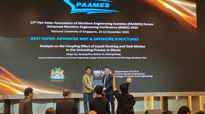本次会议期间,江苏科技大学的朱仁庆教授代表学会参加了11th PAAMES国际常委会第三次会议,并正式提出在2029年由学会主办13th PAAMES/AMEC 2029会议的申请。 AMEC(2025)学术交流环节,江苏科技大学、中国船舶科学研究中心6位论文作者分别宣读了学术论文,其中江科大曲庆一、朱仁庆、涂瑞华、章新龙共同撰写并宣读的学术论文“Analysis on the Coupling Effect of Liquid Sloshing and Tank Motion in the Unloading Process in Waves”获得大会最佳论文奖。