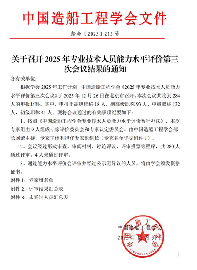 2025年12月26日,中国造船工程学会在京举行了年度专业技术人员能力评价和认定会议,学会组织报送的27名专业技术人员通过了评审,其中:正高级职称1人、副高级职称10人、中级职称15人、初级职称1人,取得了学会开展专业技术人员能力水平评价和认定工作的圆满成功。今后,学会将依照中国造船工程学会的具体要求和规范,常态化开展此项工作。